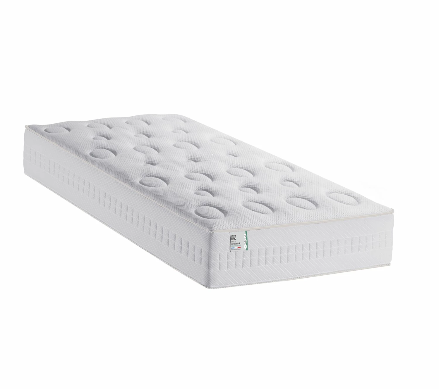 - Tissu micro-aéré et complexe ouatiné en fibres polyester recyclées : une parfaite hygiène du matelas, action d’auto-ventilation et de régulation de la température en toutes saisons.